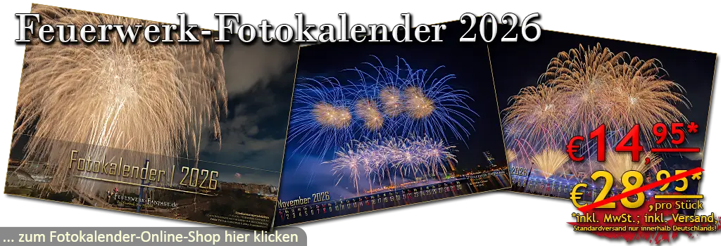 Alle Termine und Informationen im Feuerwerkskalender wurden nach bestem Wissen und Gewissen recherchiert. Die Autoren der FEUERWERK-FANPAGE.de übernehmen jedoch keine Gewähr für Vollständigkeit, Korrektheit oder Aktualität der Inhalte.